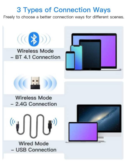 Wireless Mode | 2.4G RF , Bluetooth, Corded |