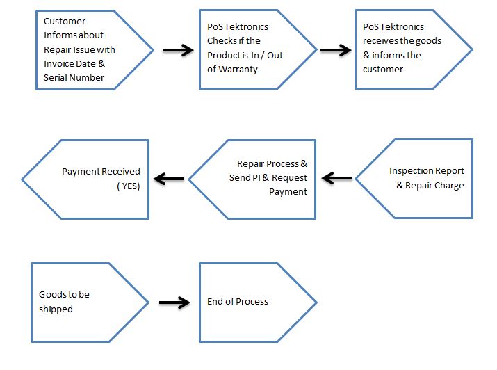 The Turn Around time for repair or replacement is 10 working days. Once the product is received for repair, PoS Tektronics will inform the customer about the same. The Turn Around time does not include weekends or holidays. Out of warranty products TAT is also 10 Days once customer confirms the repair charges provided by PoS Tektronics.